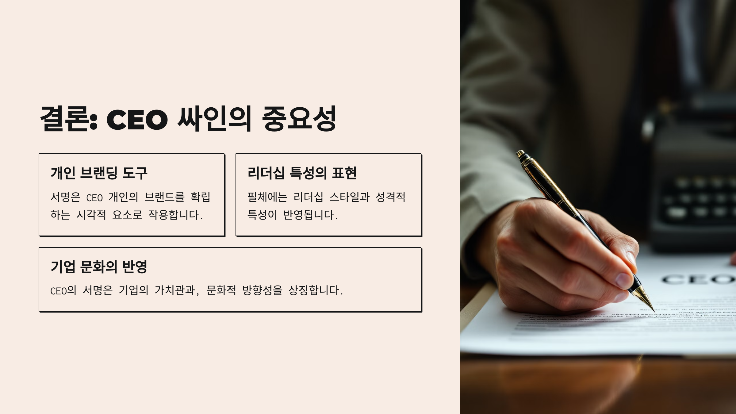 지금까지 다양한 CEO들의 싸인을 분석하면서, 그들의 성격과 경영 철학이 싸인에 어떻게 반영되는지 살펴봤어요. ✍️