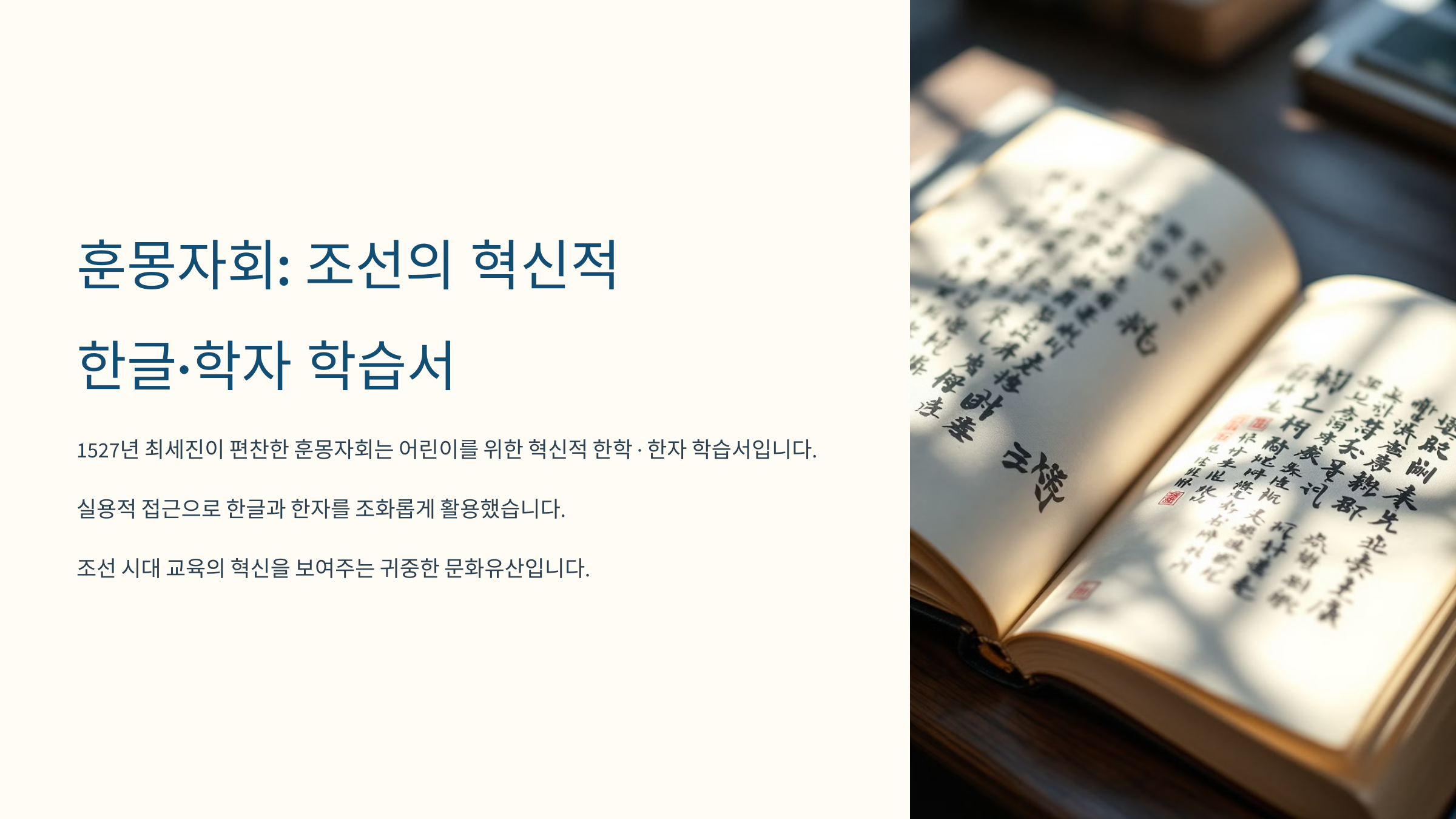 이제부터 훈몽자회의 탄생 배경, 구성과 특징, 역사적 의미, 그리고 현대에서의 활용까지 자세히 살펴볼게요! 📚