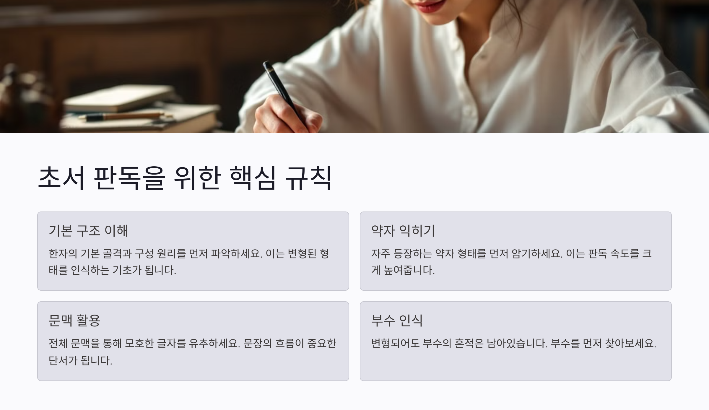 초서를 판독할 때 가장 먼저 해야 할 일은 '획의 패턴'을 파악하는 것이에요. 초서는 필기 속도를 높이기 위해 획을 줄이거나 이어 쓰는 특징이 있기 때문에, 특정 패턴이 반복되는 경우가 많아요. 초서에서 자주 변형되는 글자들을 익히면 판독이 훨씬 쉬워져요.