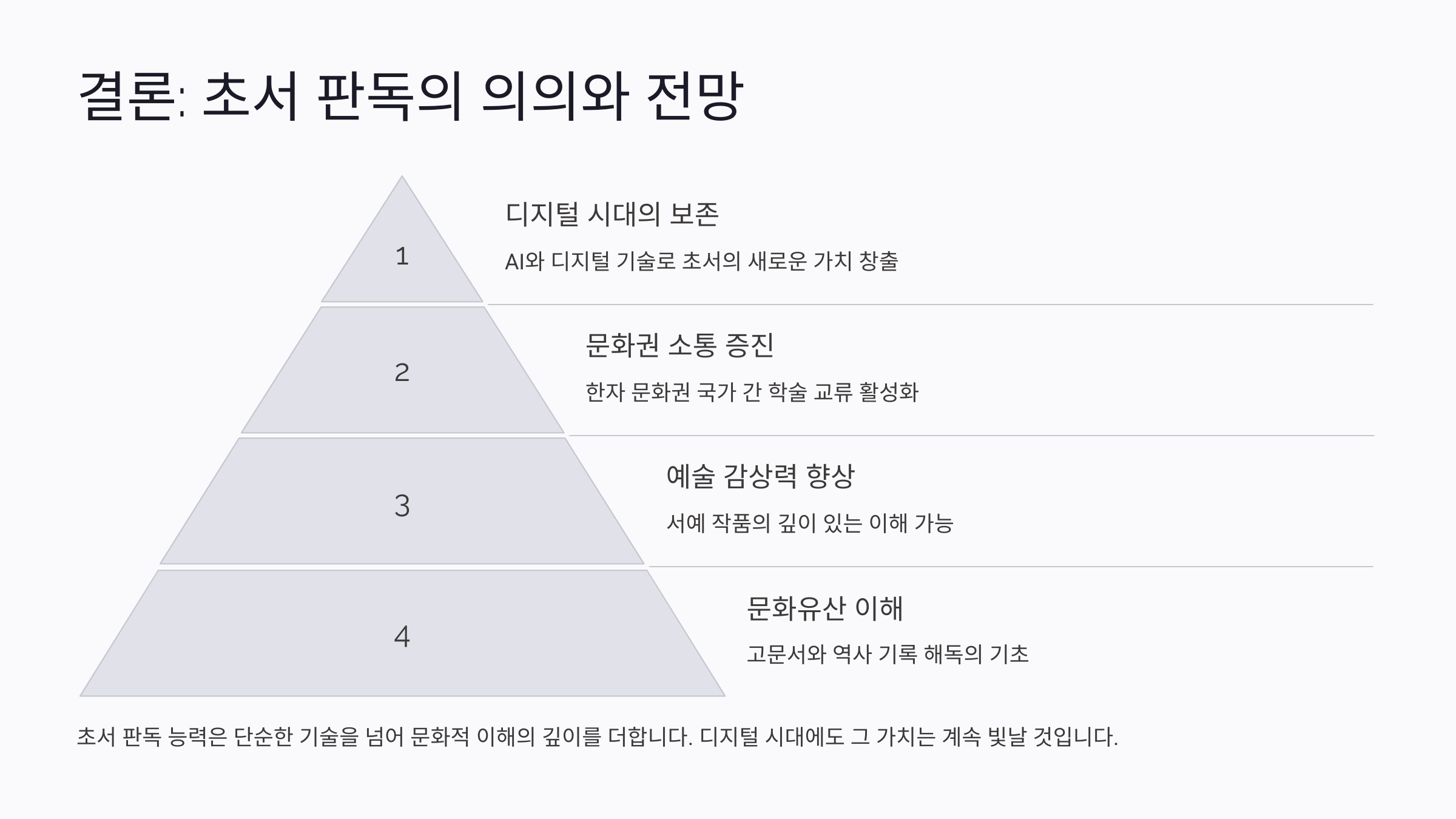 실수 유형 설명 해결 방법 획을 모두 찾으려 함 초서에서는 일부 획이 생략될 수 있음 글자의 전체 형태와 흐름을 파악 문맥을 고려하지 않음 한 글자만 보고 의미를 단정 지음 앞뒤 문장과 연계하여 해석 서체 차이를 고려하지 않음 작가마다 필체가 다름 여러 서예가의 필체를 비교하며 학습 이런 실수를 줄이면 초서를 훨씬 수월하게 읽을 수 있어요. 특히 초서 학습 초반에는 '모든 획을 보려 하지 않기'와 '문맥 속에서 의미를 파악하기'를 꼭 기억해야 해요.