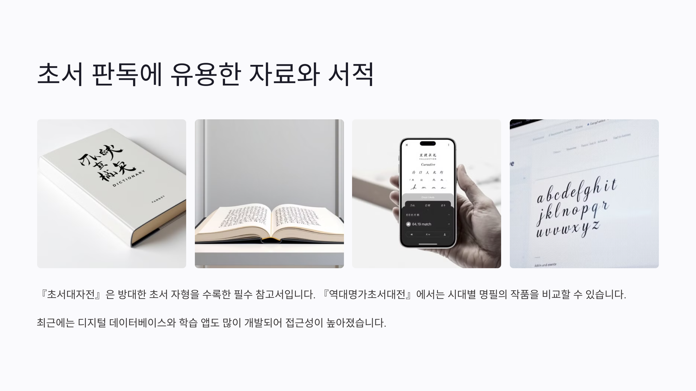 초서 판독 능력을 향상시키기 위해서는 좋은 자료와 서적을 참고하는 것이 중요해요. 초서는 시대별, 서예가별로 다양한 형태로 발전해 왔기 때문에 여러 문헌을 비교하며 학습하는 것이 효과적이에요.