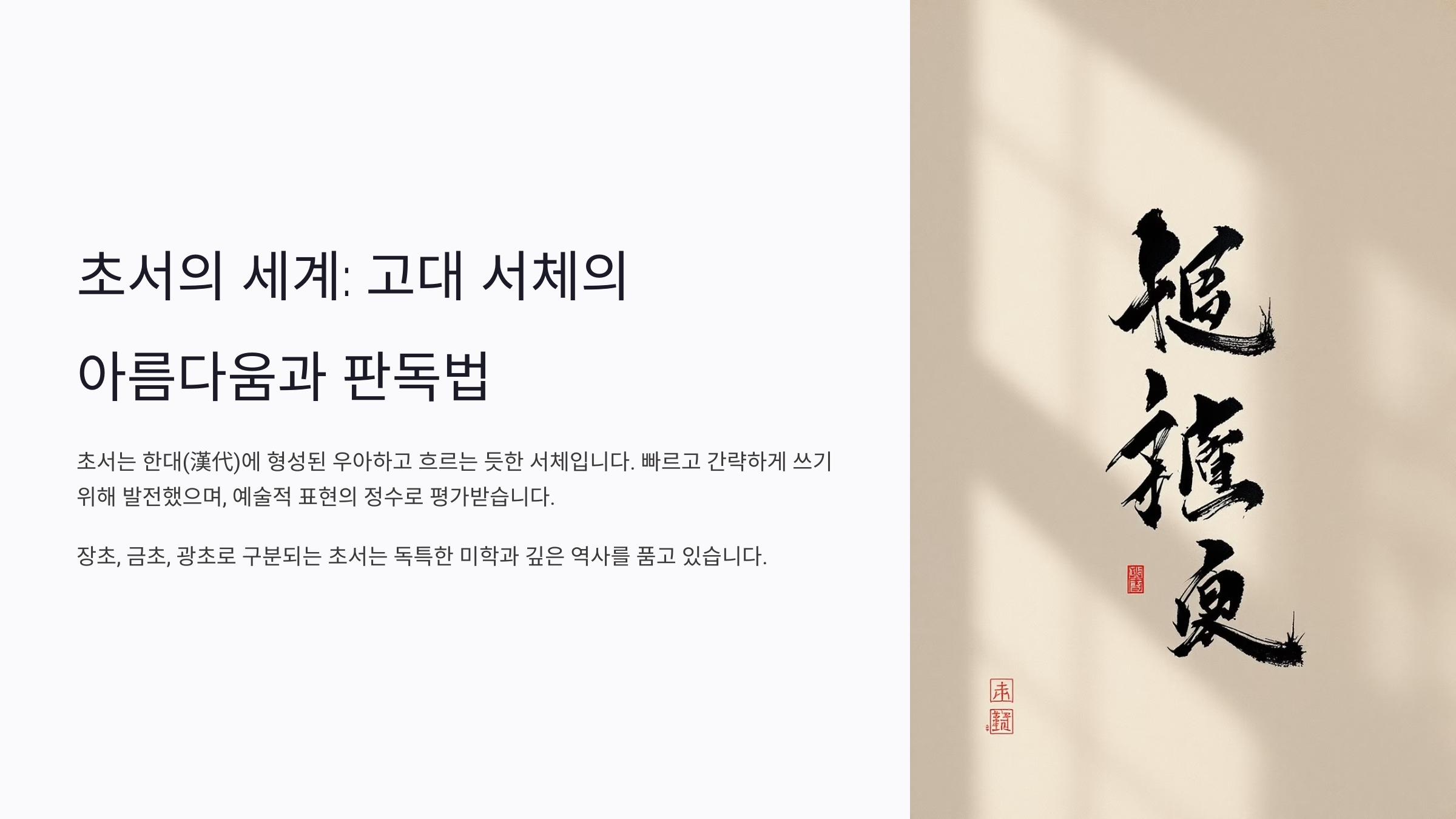 초서는 한자의 필기체로, 한대(漢代)부터 발전하기 시작했어요. 한자의 기존 획을 단순화하고 이어 쓰면서 더욱 빠르게 기록할 수 있도록 만들어졌어요. 당시 관료나 학자들이 문서를 신속하게 작성할 필요가 있었기 때문에 초서가 널리 사용되었죠.