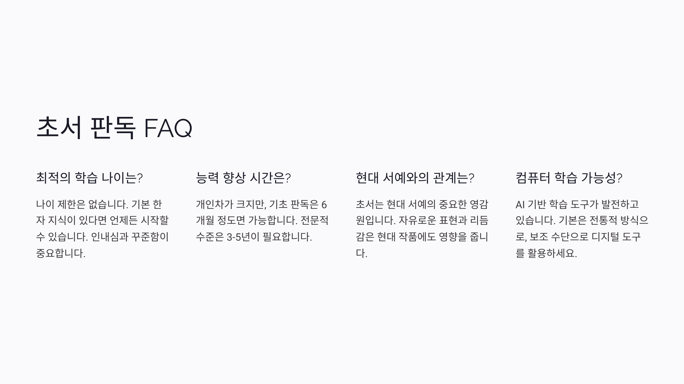 A3. 개인의 학습 속도에 따라 다르지만, 기본적인 초서 글자를 익히는 데는 3~6개월 정도 걸려요. 꾸준히 연습하면 점점 더 빠르게 읽고 쓸 수 있게 돼요.