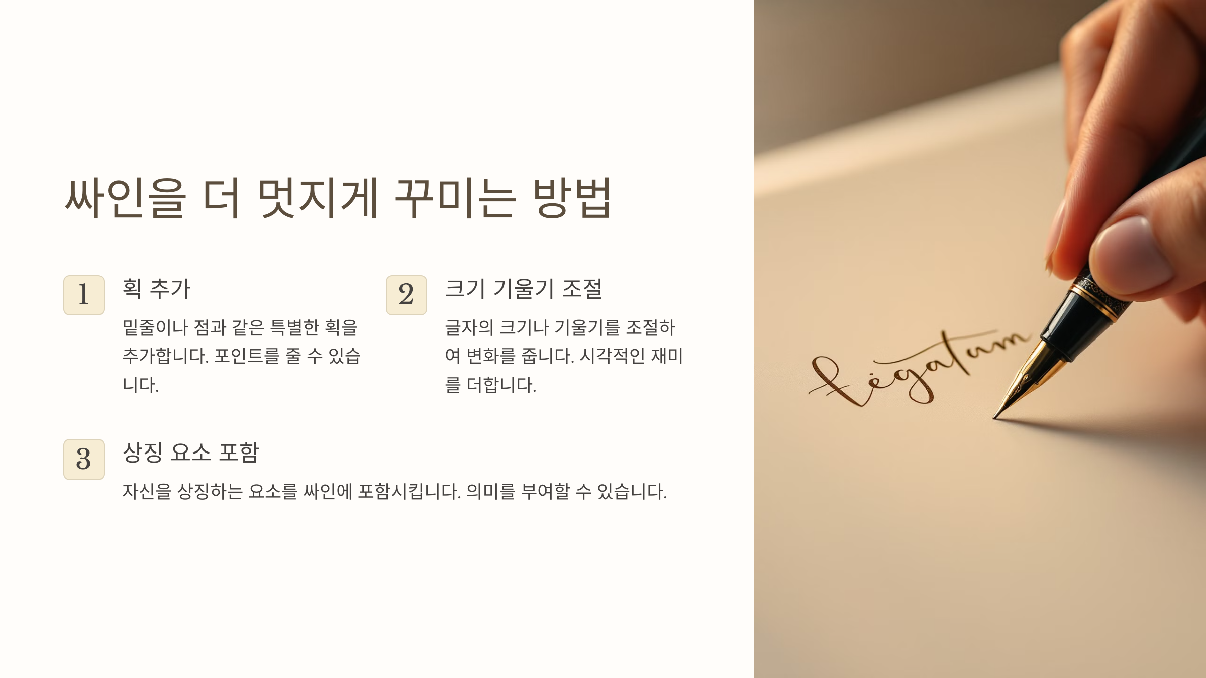 싸인을 단순히 쓰는 것보다, 멋진 스타일로 연출하면 더 특별해 보여요! 몇 가지 요소를 추가하면 싸인을 더 개성 있고 세련되게 만들 수 있어요. ✍